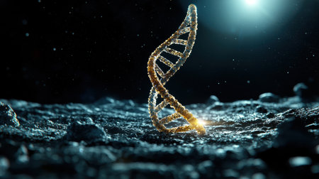 A DNA strand is shown in a dark, rocky area. Concept of mystery and wonder, as the DNA strand is a symbol of life and the building blocks of all living things