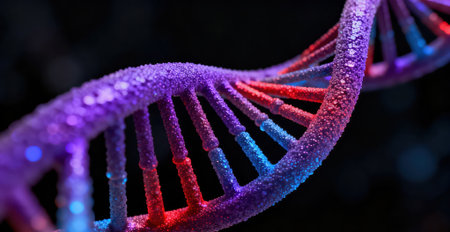 Vibrant depiction of a DNA double helix, showing its complex structure and the intricacies of genetic material in a lab setting.