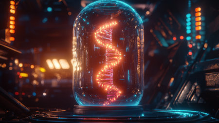 This image captures a futuristic scene with a luminous DNA helix encased in a glass container, set against a high-tech laboratory backdrop featuring vibrant neon lights.
