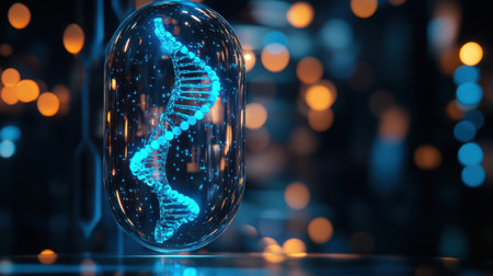 Stunning digital artwork showcasing a glowing DNA strand encased within a transparent capsule, emphasizing the advancements in genetics and biotechnology.