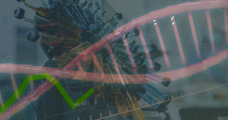 Image of digital interface graphs, statistics and rotating DNA strands over spinning test tubes. Global virus pandemic concept digitally generated image.