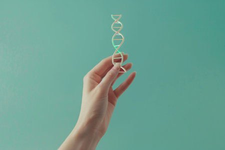 A hand holding a stylized DNA helix model against a soft turquoise background, symbolizing genetics and biotechnology