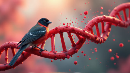 Bird on DNA Strand with Virus Particles, generative Ai