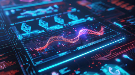 Floating DNA helix in biotech interface, glowing grid, HUD circles, hex icons, data nodes and lines. Science, technology, innovation, futurism, digital, biotech, data visualization