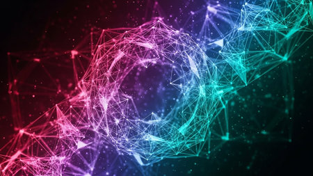 An abstract geometric network structure with glowing particles and a gradient of pink, purple, blue, and teal colors against a dark background.