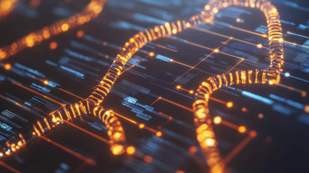 Digital backdrop portraying vibrant orange circuitry patterns oscillating with data streams, illustrating the essence of modern technology and innovation in a captivating visual.