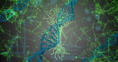 Presenting stylized blue DNA helix entwining neon-green circuit-tree at center, showing nodes, code. Genetic, biotech, circuitry, cybernetics, holographic, grid, network