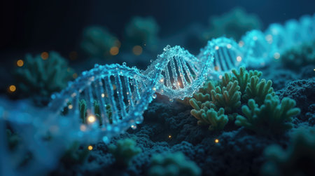 A detailed view of a double helix model of DNA is set against a colorful coral reef. The scene captures the harmony of science and nature, highlighting the beauty of both worlds