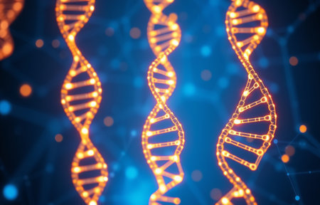 DNA helix with glowing particles on dark background