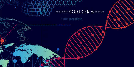The artwork illustrates a vibrant DNA double helix made of interconnected nodes, showing a blend of colors.