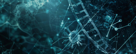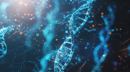 An intricate close-up view displays advanced genetic structures interconnected in a futuristic design. The molecular patterns highlight the beauty of science and technology.