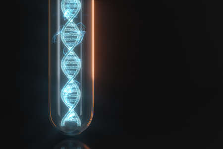 3D Illustration DNA molecule, its structure. Concept human genome. DNA molecule with modified genes. Conceptual illustration of a dna molecule inside a glass test tube with liquid. Medical equipment