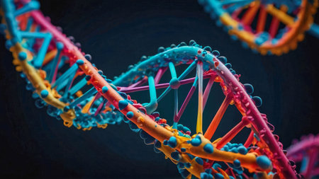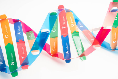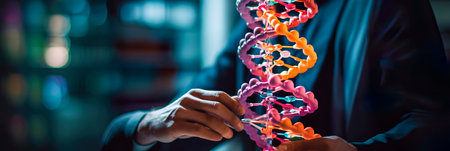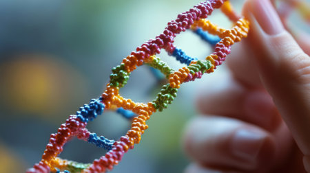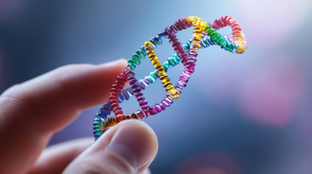 A close-up image presents a colorful DNA model held by a finger against a blurred background. The model displays a spiral structure with vibrant hues and textural details. This composition may be suitable for scientific, educational, or medical publications or commercial projects requiring visuals related to genetics.