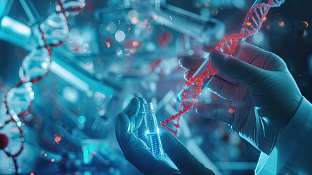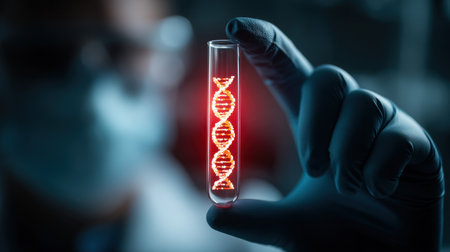 A focused image showcasing a gloved hand holding a test tube with a vibrant, glowing DNA helix inside. This symbolizes advancements in genetics and biotechnology research.