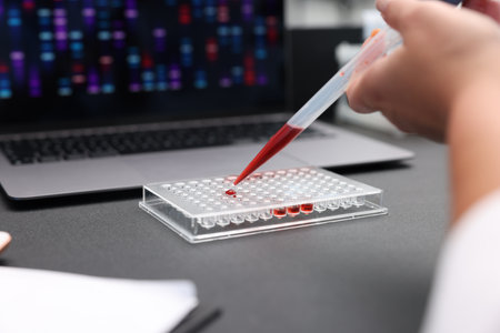 Research in genetics. Scientist with micropipette and microplate working at table in laboratory, closeup
