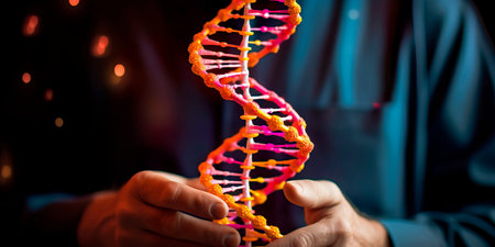Two hands carefully hold a vibrant, intricately colored DNA model, showcasing its double helix structure. The image features a close-up perspective against a dark backdrop. This visual could be used in scientific publications, educational materials, or presentations related to genetics and molecular biology. The model exhibits a textured surface, possibly created via 3D printing.