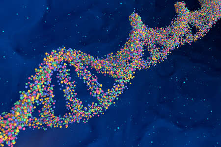 Dna helix enlarged model in bright colors and spots. Concept of genetics, science and medicine. Biotech. 3d rendering copy space toned image. Generative AI