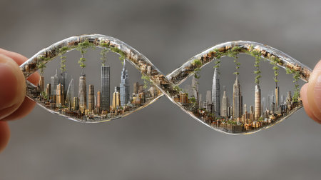 This image offers a unique perspective on the fusion of urban development and nature, illustrating sustainability through a creative DNA helix structure.