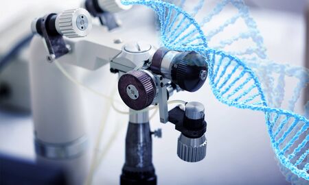 Genetic engineering concept. Microscope and holographic dna spiral in abstract laboratory