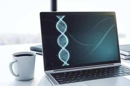Creative light DNA illustration on modern computer monitor, science and biology concept. 3D Rendering