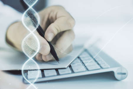 Double exposure of creative DNA hologram and hand writing in notebook on background with laptop. Bio Engineering and DNA Research concept