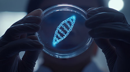 Scientist holding a petri dish with holographic DNA strands floating above, symbolizing gene editing