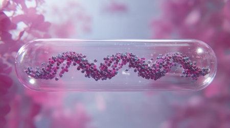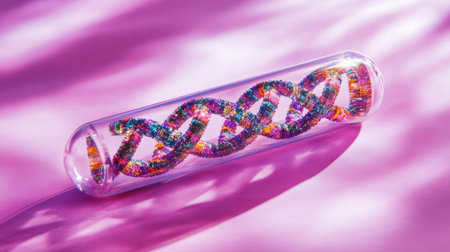 Artistic representation of DNA in a glass tube with colorful particles, set against a soft pink backdrop. Perfect for scientific, educational, and creative projects.