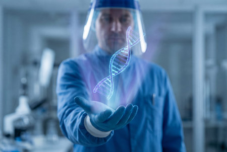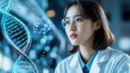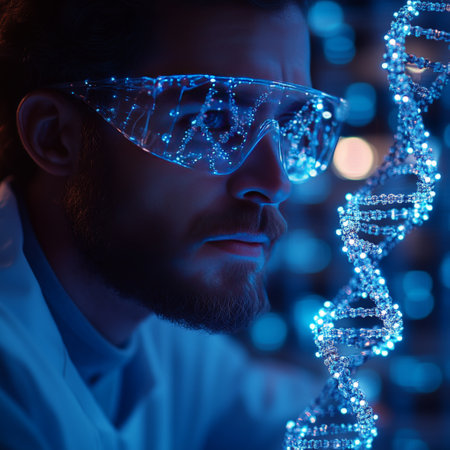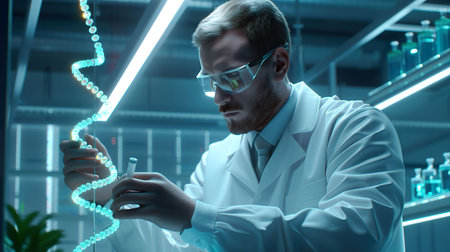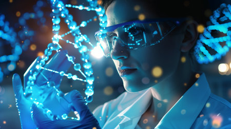 Scientist analyzing holographic DNA strands, modern lab environment, cool blue tones, medium shot, focused lighting