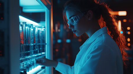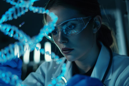 Woman analyzing DNA structure in a modern lab setting during a scientific research session