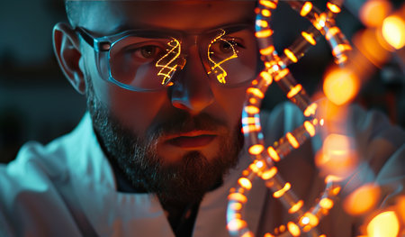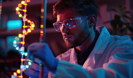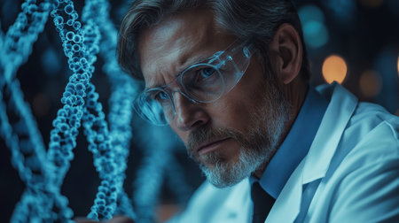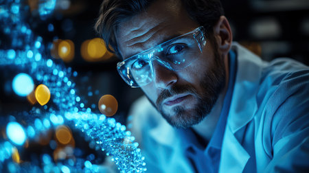 A scientist in a lab coat studies a complex DNA structure, illuminated by blue lighting. His concentration reflects the importance of genetic research, enhancing the atmosphere of discovery in the laboratory.