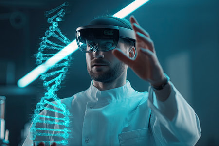 Male scientist wearing an AR headset interacting with a holographic DNA structure. Wearing an AR headset, the scientist examines a dynamic DNA structure for valuable research insights.