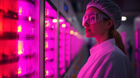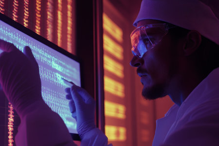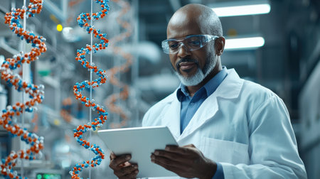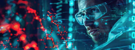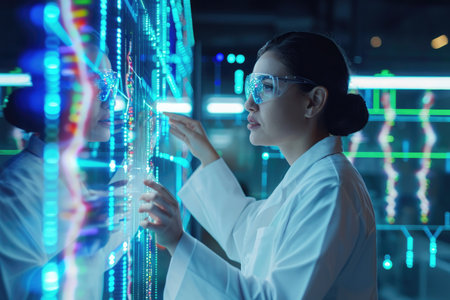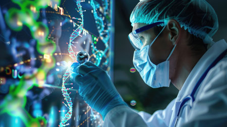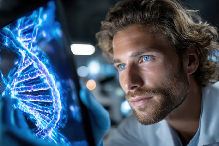 A dedicated scientist examines DNA structure within a high-tech laboratory, showcasing the intersection of technology and biology in scientific research.