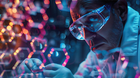 Scientist Examining Molecular Structure in Advanced Lab with Bright Molecular Model