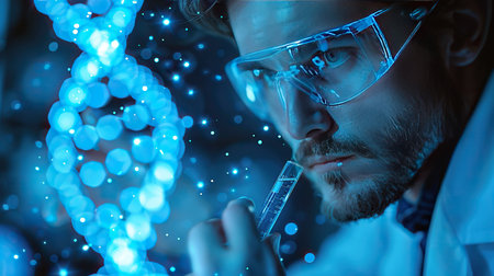 A focused scientist in a lab coat and goggles examining a glowing DNA helix in a futuristic laboratory setting, representing biotechnology and genetic research.