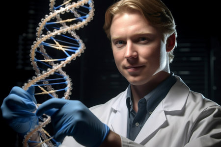 Researcher wearing gloves, holding a DNA strand model, symbolizing advancements in genetic technology