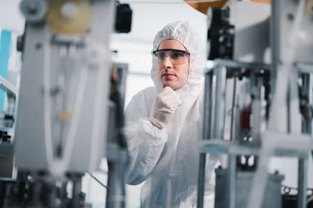 The scientist works in a modern scientific laboratory for the research and development of microelectronics and processors. Microprocessor manufacturing worker uses computer technology and equipment.