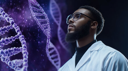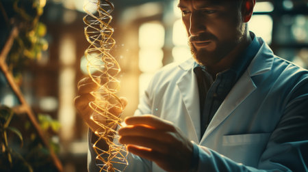 A man in a lab coat is looking at a DNA strand. Concept of curiosity and scientific exploration