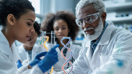 A group of scientists are working together in a lab, with one of them pointing to a DNA model. Scene is collaborative and focused