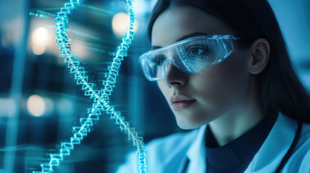 A focused female scientist in a lab is analyzing genetic information while wearing protective glasses, surrounded by digital DNA structures, emphasizing advancement in biotechnology.