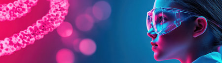 A woman wearing glasses is looking at a DNA strand. Concept of curiosity and fascination with the subject matter