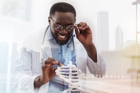 Curious doctor touching genome model