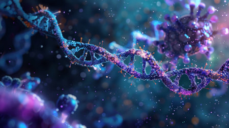 An artistic rendering showcases a glowing purple DNA strand against a dark backdrop. The image utilizes selective focus, creating a blurred effect in the background while highlighting the central subject. This illustrative piece could be suitable for educational, scientific, or conceptual projects, offering versatility in various media applications.
