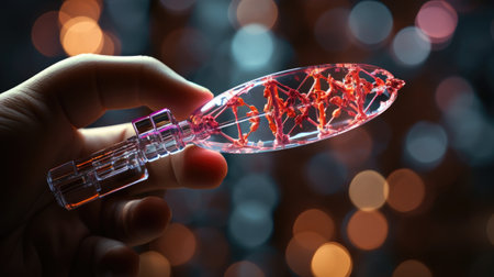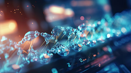 An intricate close-up view displays advanced genetic structures interconnected in a futuristic design. The molecular patterns highlight the beauty of science and technology.