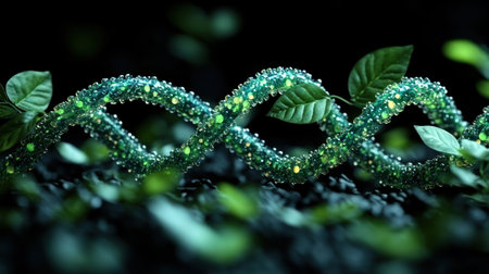 A sparkling blue DNA strand intertwined with lush green leaves, representing the connection between genetics and nature.