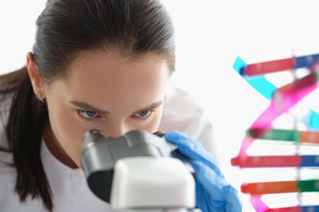 Woman scientist looking through a microscope, studying dna