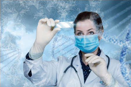 DNA molecule testing research concept. Doctor looks at a DNA sample on a blurred background.