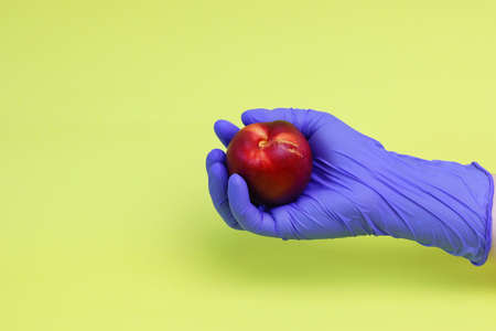 A hand in a blue glove holds red nectarine on yellow