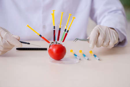 Genetically modified food. Scientist in laboratory injecting chemicals into red tomato for further analysis