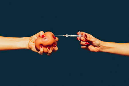 Hand holding apple fruit with syringe with chemical fertilizers of red colour in apple. GMO and pesticide modification. Scientist in gloves injecting apple with red fertilizer