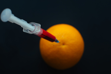 A man injects chemicals into an orange, pesticides and fertilizers and chemicals with a syringe to increase the shelf life of the fruit.
